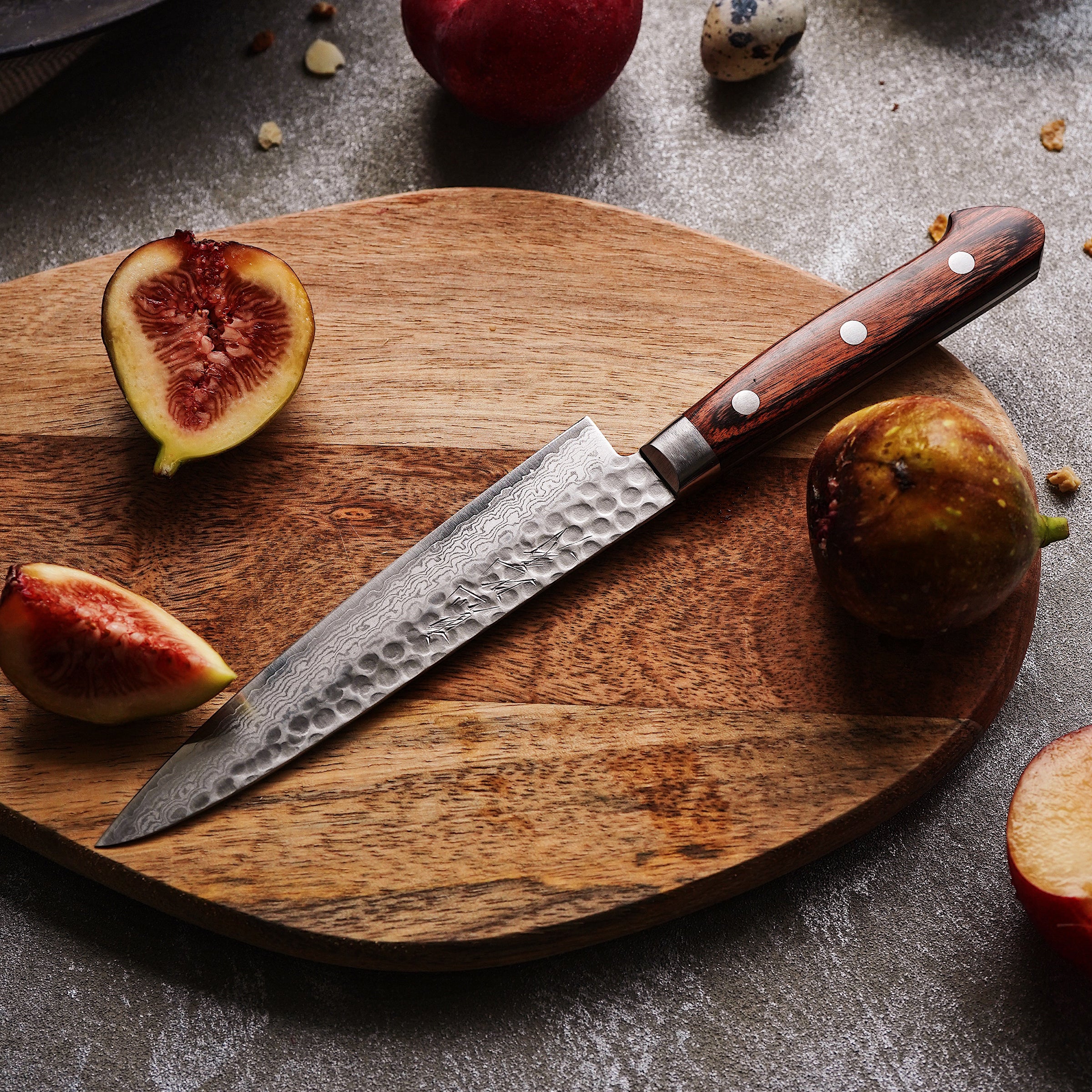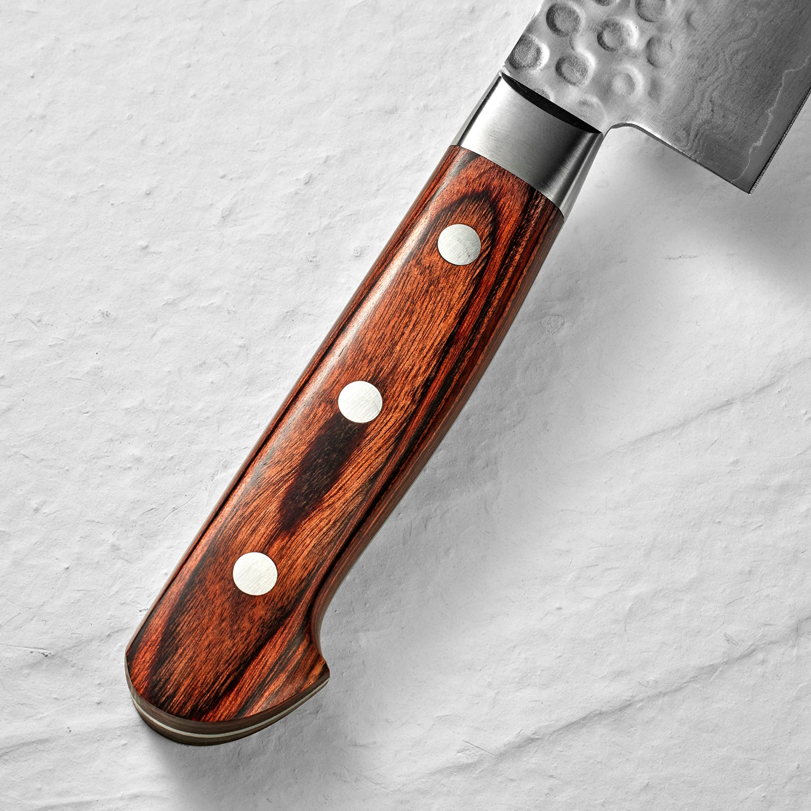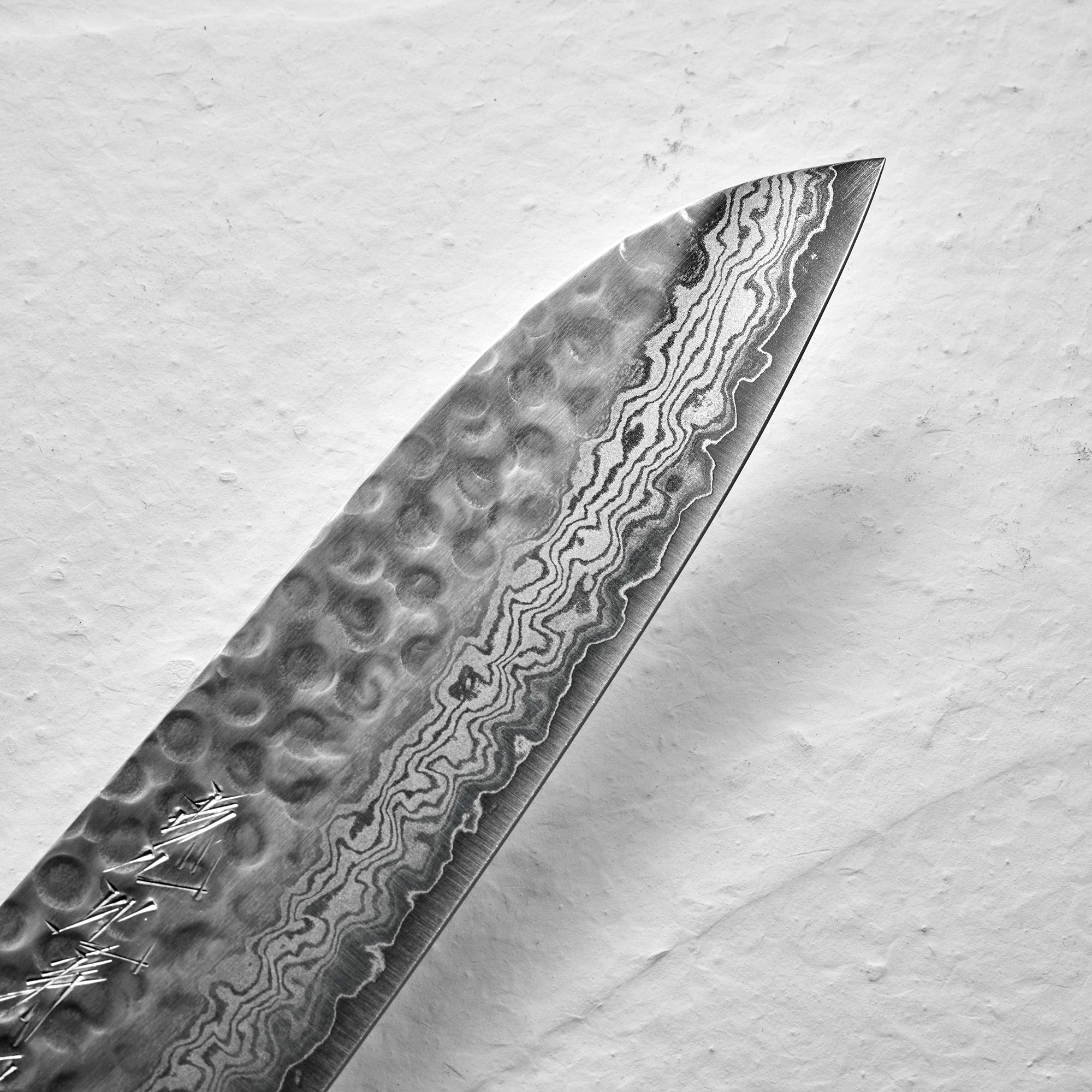 叩いて、鍛えた、槌目仕上げと、重ねて、延ばして、鍛えるダマスカス製法を上下で組み合わせました。その表情はまるで凪のように穏やかです。